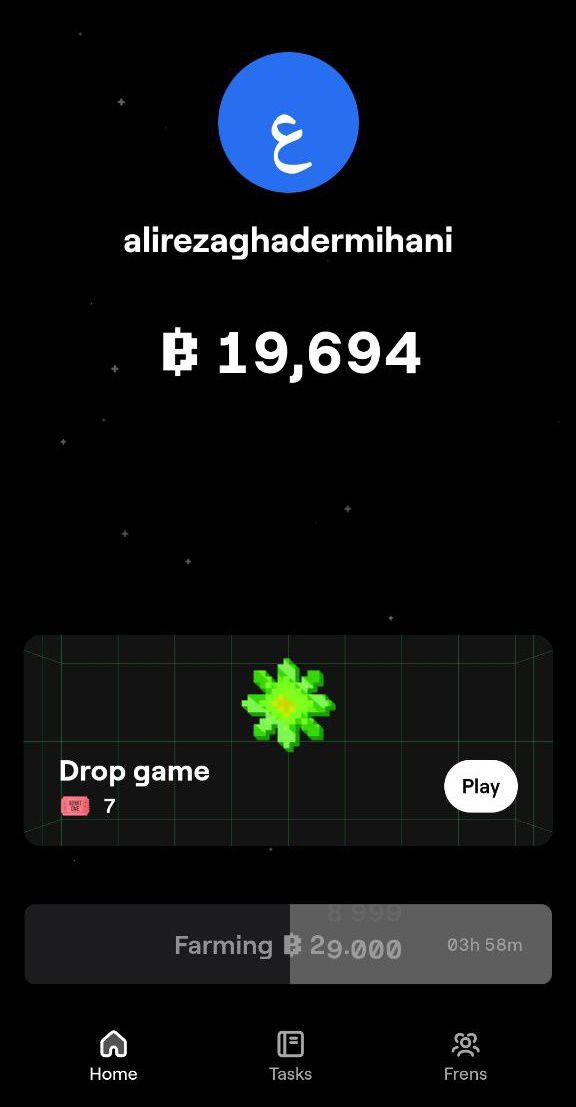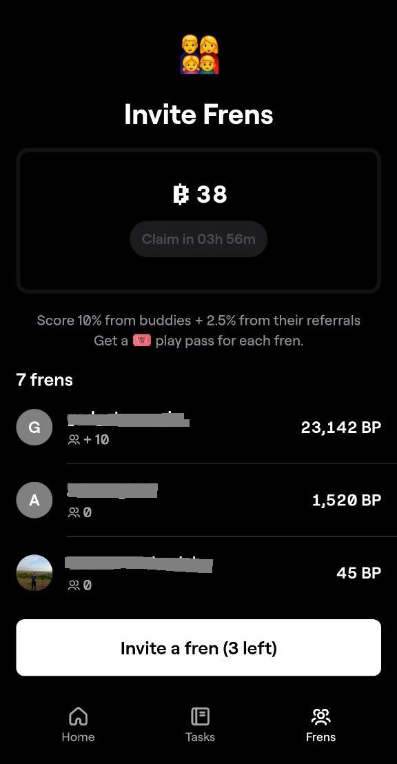 متاسفانه پروژه Blum به منظور پاسخگویی به کاربران و ممانعت از ورود ربات‌ها به بازی، ورود به مینی اپلیکیشن خود را محدود کرده و برای بازی کردن نیاز به یک کد دعوت دارید. تا پیش از این به لیست انتظار می‌رفتید که هم‌اینک این گزینه برداشته شده و فقط باید با یک کد دعوت به بازی ورود کنید. صفحه آغازین بازی شامل سه گزینه Home، Tasks و Frens می‌شود که هر یک از آنها را در ادامه توضیح می‌دهیم.
